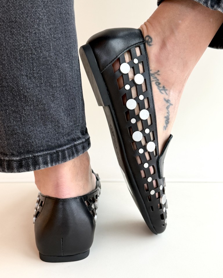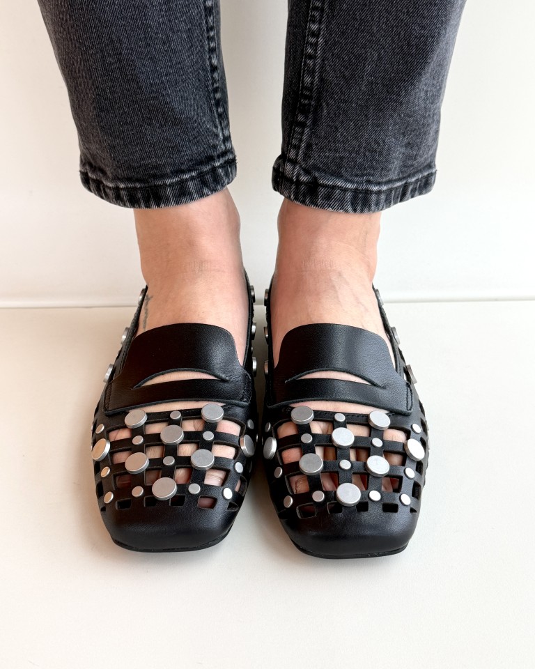 Borchie schiacciate argento, stile bottone, lungo tutta la tomaia.