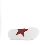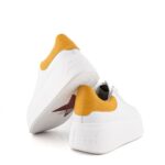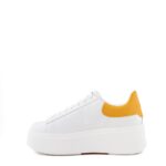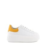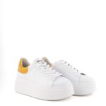 Ash Moby sneakers donna in pelle bianca con talloncino in contrasto in pelle gialla stampata. Lacci bianchi e maxi logo impresso sul retro della suola.