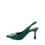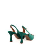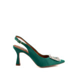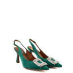 Bibi Lou slingback in raso colore verde arricchita da maxi fibbia quadrata con strass argento. Forma sfilata, tacco rivestito in raso e allacciatura regolata da piccola fibbia.