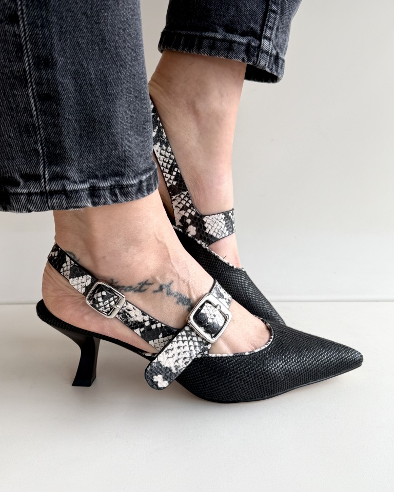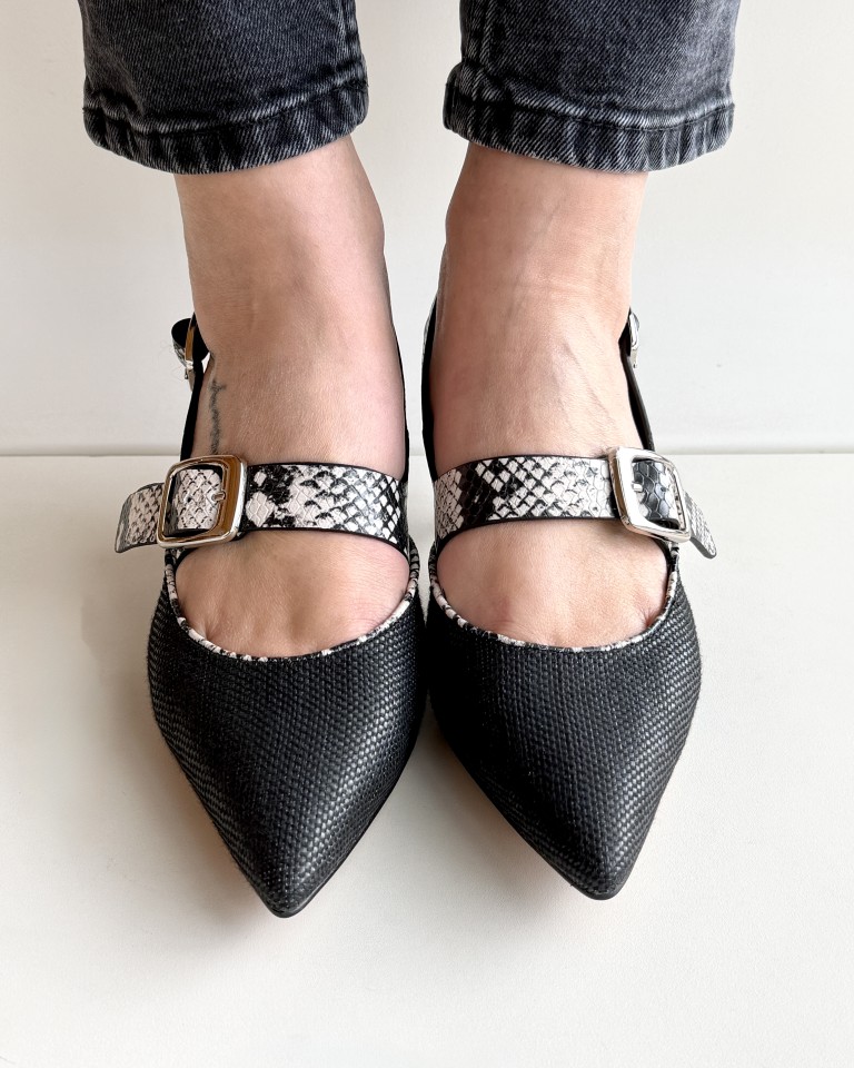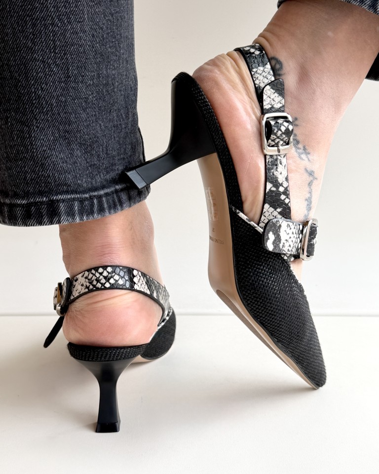 Bruno premi slingback in rafia nera e pelle stampata pitone.