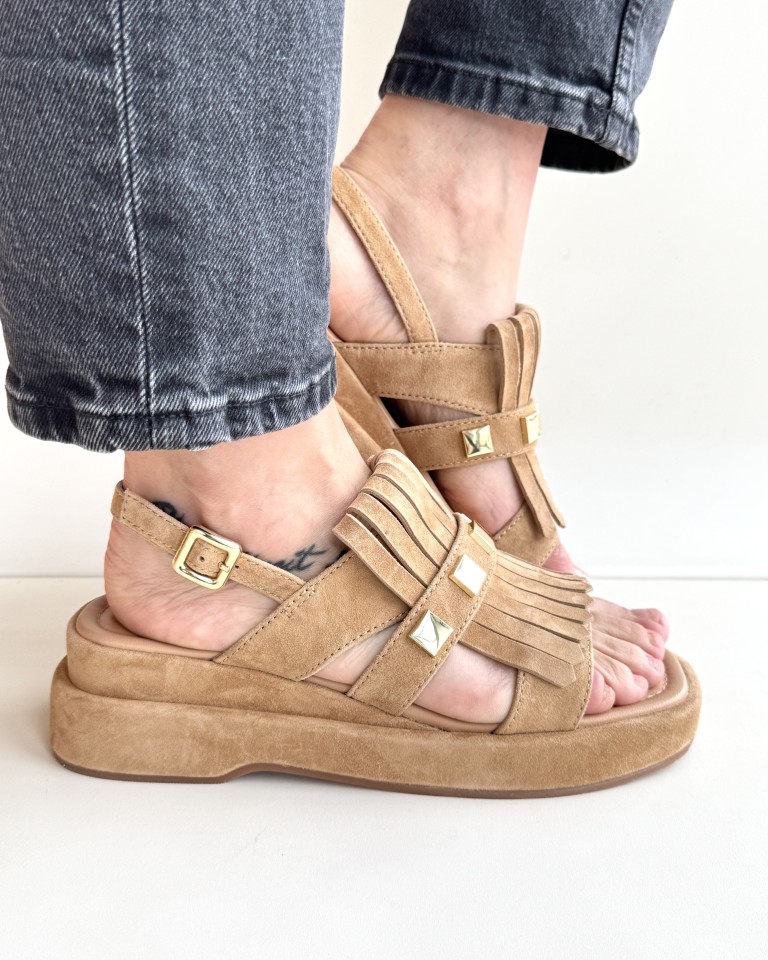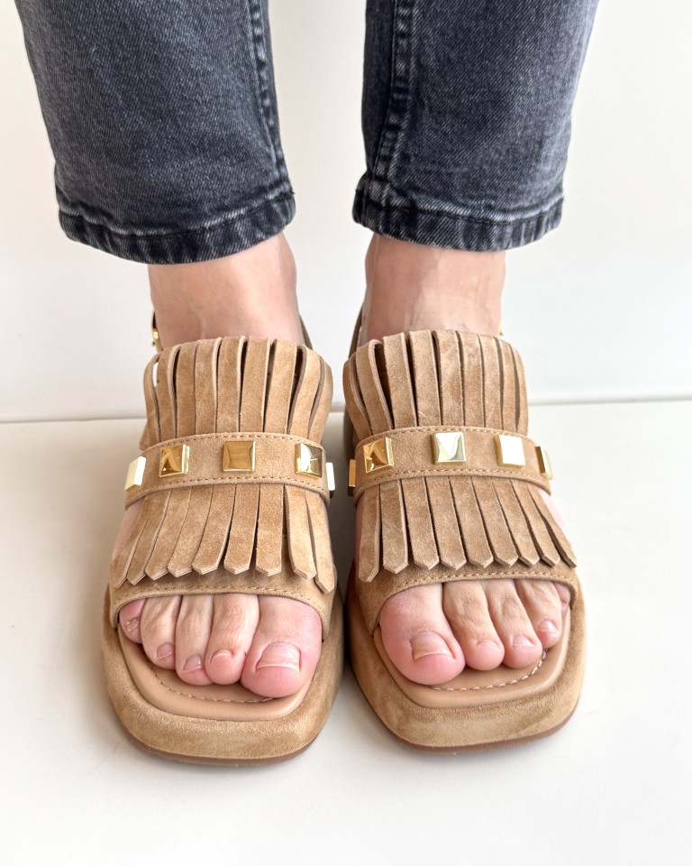 Tomaia con maxi frangia e borchie quadrate oro.