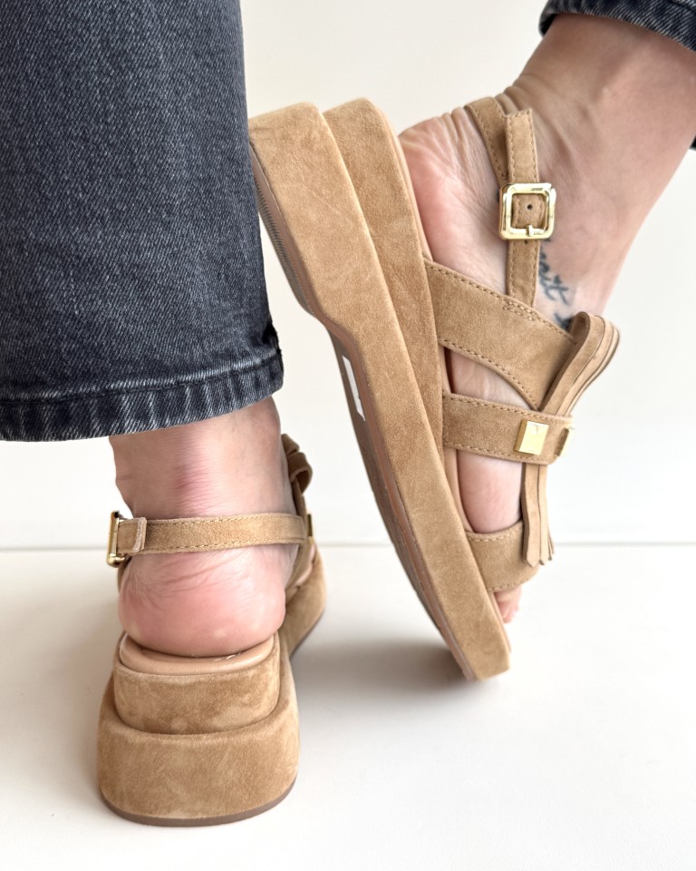 Bruno Premi sandalo zeppa donna in camoscio cammello.