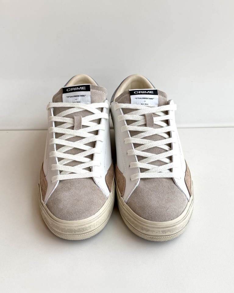 Talloncino in crosta grigia e dettagli in camoscio nocciola.
