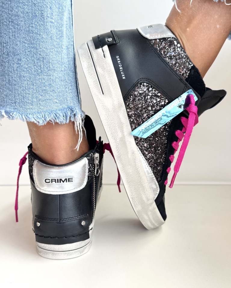 Crime London Sk8 Deluxe Mid sneakers in pelle e glitter nero.