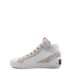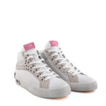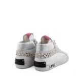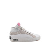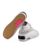 Crime London sneakers donna alta in pelle bianca. Profilo in crosta bianca invecchiata ricoperta di borchie forma piramide colore argento, lacci bianchi, occhielli argento, Linguetta bianca con riporto in nabuck rosa logato, dettaglio sul retro in pelle argento stampa rettile, talloncino in pelle nera con micro borchie argento. Suola bianca effetto invecchiato con scritta “love” sul lato esterno.