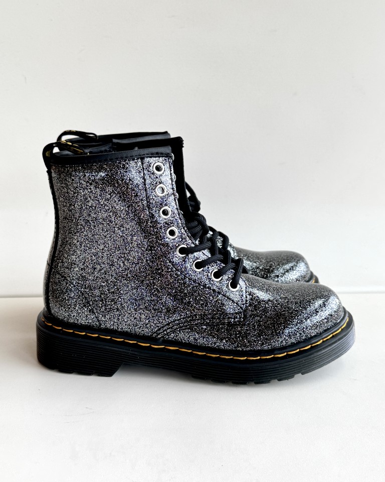 Dr. Martens anfibio in pelle lucida nera con effetto in glitter argento.
