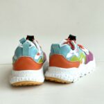 Tomaia in nylon bianco con pois arancio, verde e lilla.