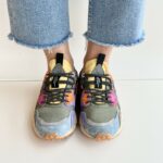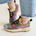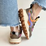Tomaia in tessuto tecnico verde militare con riporti in camoscio arancio, lilla, verde e polvere.