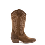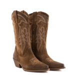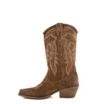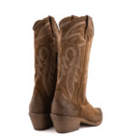 Metisse stivale dalla forma sfilata linea texano in crosta marrone effetto invecchiato e sporcato con ricami beige.