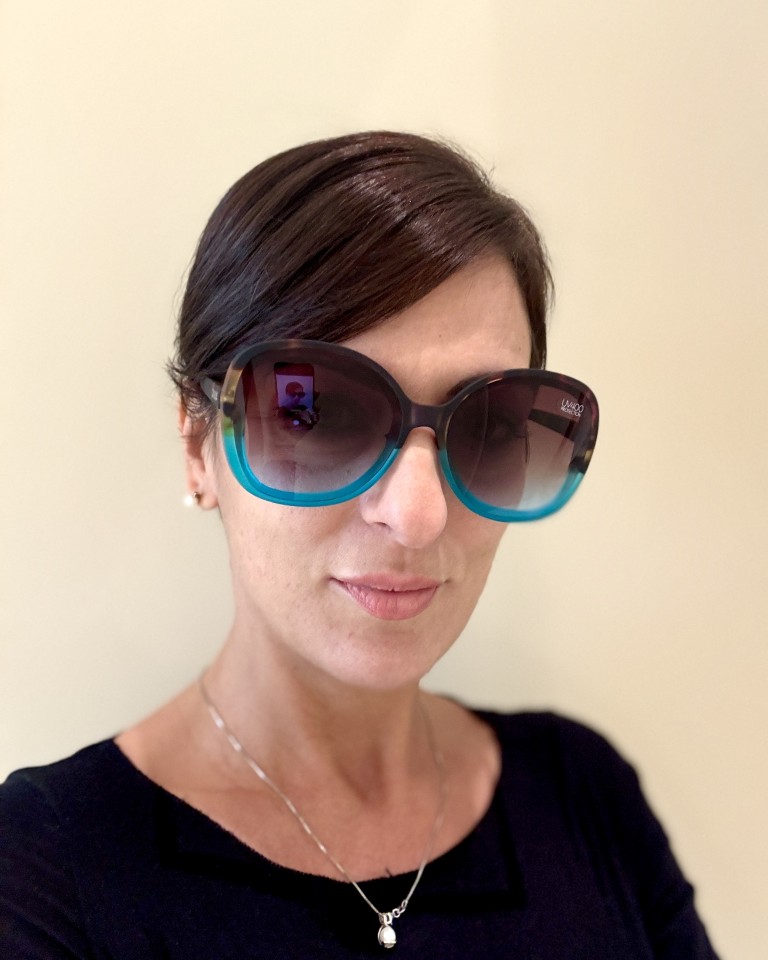 Okkia occhiale da sole linea butterfly bicolore marrone tartarugato e azzurro.