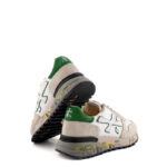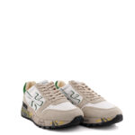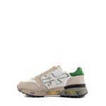 Premiata sneakers uomo modello Mick. Tomaia in camoscio avorio e nylon bianco. Maxi logo laterale in pelle bianca con profili verde, talloncino verde. Linguetta in nylon beige e lacci in cotone in tinta.