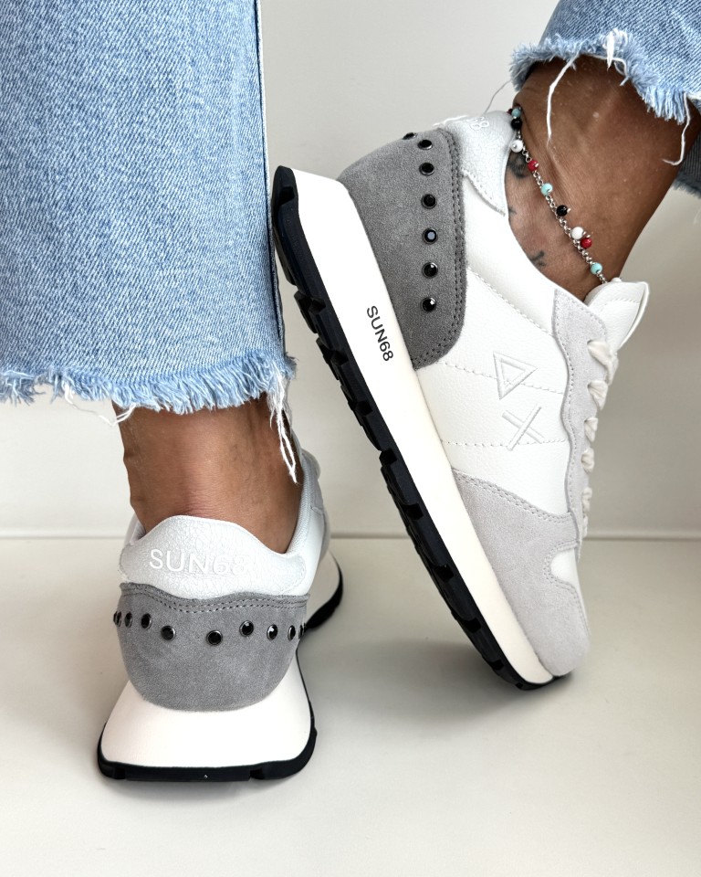 Rifiniture in camoscio grigio chiaro e grigio scuro.