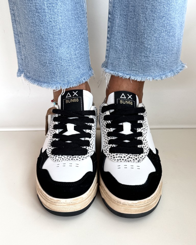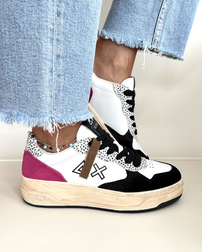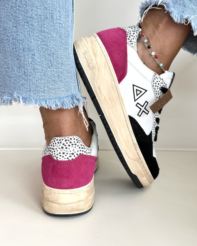 Sun 68 sneakers in pelle bianca, camoscio nero e fuxia.