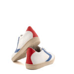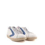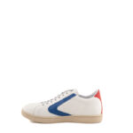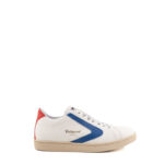 Valsport sneakers uomo modello Tournament in nappa bianca. Logo boomerang in pelle blu, talloncino rosso e lacci in cotone bianco.
