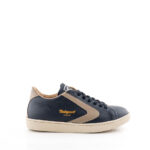 Tomaia in cervo blu con logo boomerang laterale e talloncino in pelle tortora.