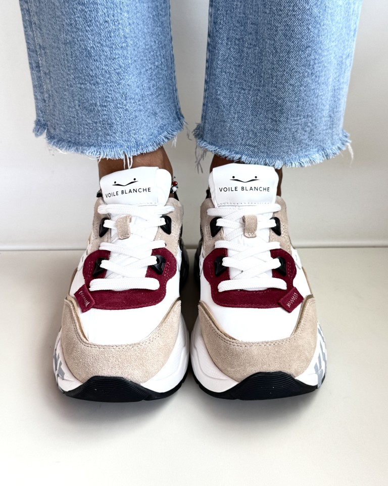 Voile Blanche Club sneakers in nylon bianco e nero con dettagli in camoscio beige e bordeaux.